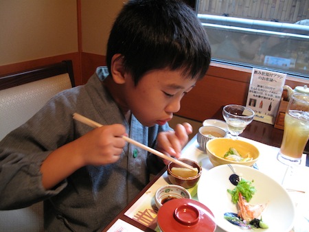 9歳の息子には和食のコースは無理かな?と思っていましたが、エビやコーンの天ぷらをパクパク。めずらしい前菜や添えられた沢ガニにも興味を持ったようで楽しんで食事をしていました。