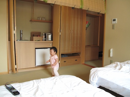 フロントでチェックインを終えると下足箱に靴を預けて、館内はすべて畳敷き。フロントからエレベーター、お部屋まで素足で気持ちよく、1歳になったばかりの娘もおぼつかない足取りとハイハイでバリアフリーのお部屋まで到着できました。