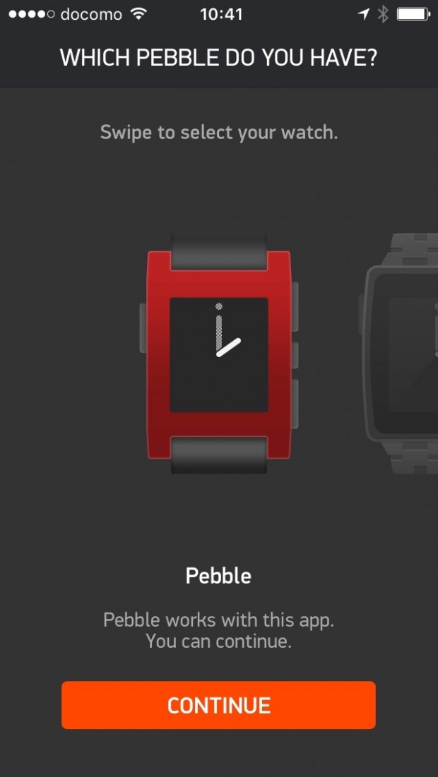 箱を開けたばかりのPebbleの画面は下のようになっていると思います。もし何も表示されていなかったら何かボタンを押しましょう。「CONTINUE」を押して次に進みます。