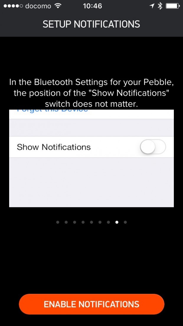 もし、押しても出てこない場合には、iPhoneのiOSの設定からBlueToothを開き、Pebbleを選択してみましょう。BluetoothがONになっていない場合もあります。
