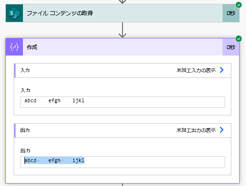 このテキストファイルをSharePointに置き、Power Automateで読み込んで見ると、うっすらと「→」マークが見え、ここにタブ文字が含まれていることがわかります。