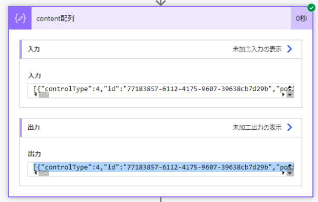 実行してみると、CanvasContent1の中身だけが取り出せました。JSONの配列になっているので、この結果を再度JSON解析に通します。