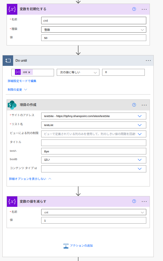 と書くことで、Byeにマッチする行だけを取得し、「項目の更新」アクションを使ってそのIDに対して更新を繰り返します。