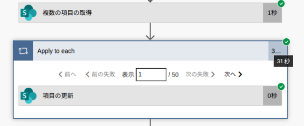 つまり、「項目の更新」アクションは、更新が必要な行数のぶんだけ呼び出されます。処理はシンプルですが問題は「Apply to each」がPower Automateのクラウドフローでは非常に遅いことです。数行の更新であればこれで問題ありませんが、数百行をまとめて更新するような場合には途方もない時間が必要になります。