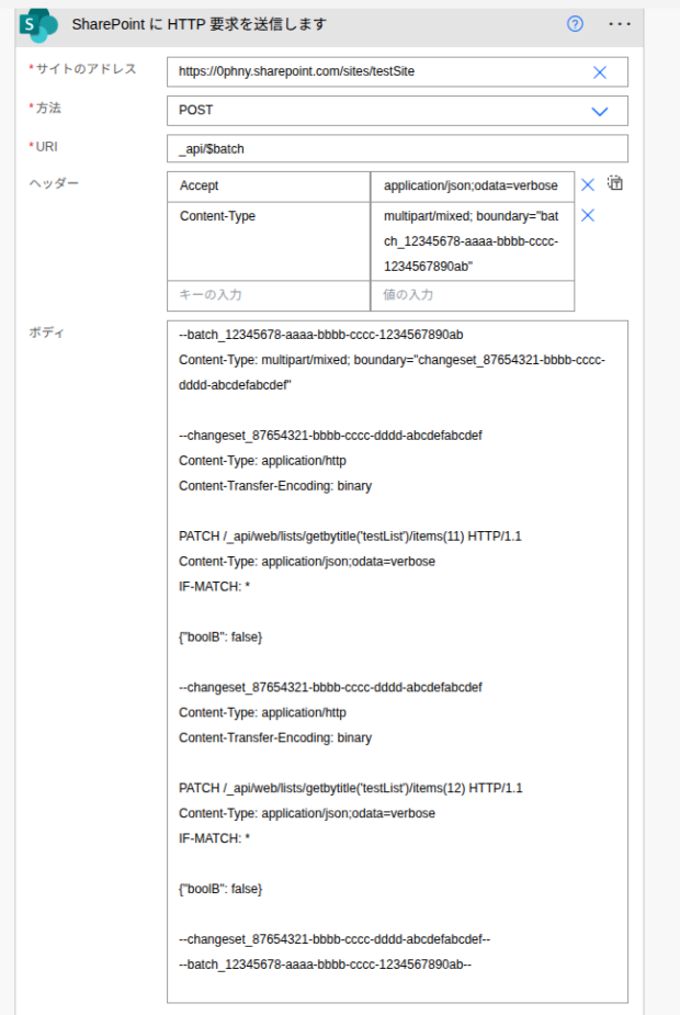 アクションはこんな感じになっていて、URIに操作に対応したAPIのエンドポイントを記述し、APIに対してボディに実行したい内容を記述して送信することで操作が可能になります。今回のような複数のSPOリストの行をまとめて更新するという場合には、ボディにその内容を記述してやるのですが・・・・。